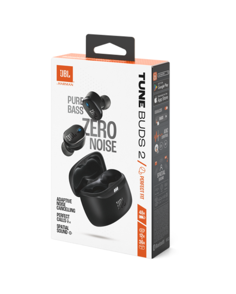 Contenido del paquete: 1 par de auriculares JBL Tune Buds 2, 1 cable de carga USB tipo C, 3 tamaños de almohadilla, 1 estuche de carga