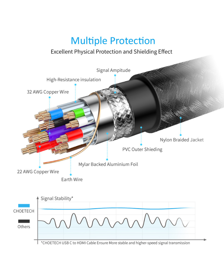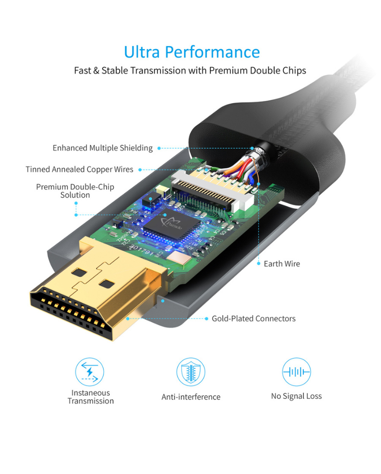 La carcasa del cable HDMI está hecha de aluminio de primera calidad con gran disipación de calor y resistencia a la corrosión, y ofrece una excelente conductividad y capacidad antitorsión, lo que le permite soportar más de 11 000 conexiones y desconexiones. El cable está recubierto con material trenzado de nailon resistente al desgarro para protegerlo eficazmente de torceduras, aplastamientos y roturas.