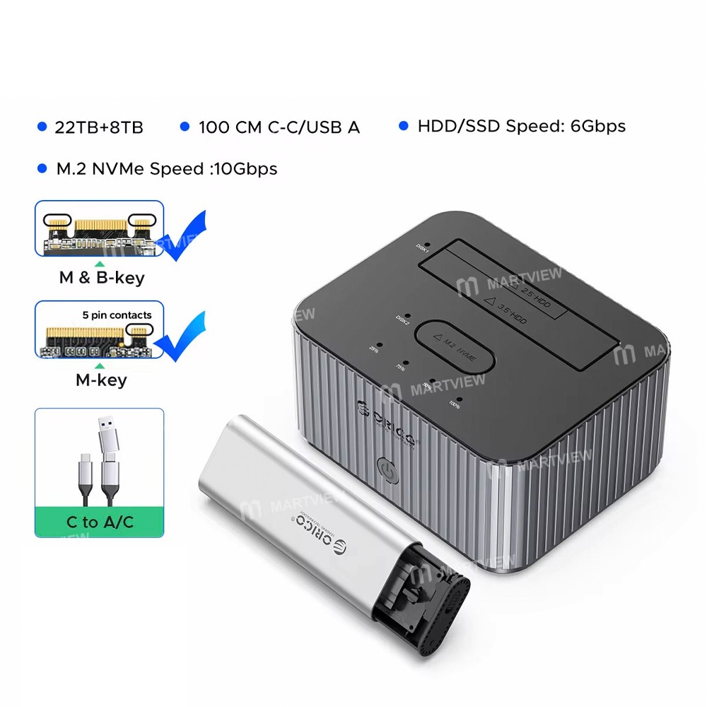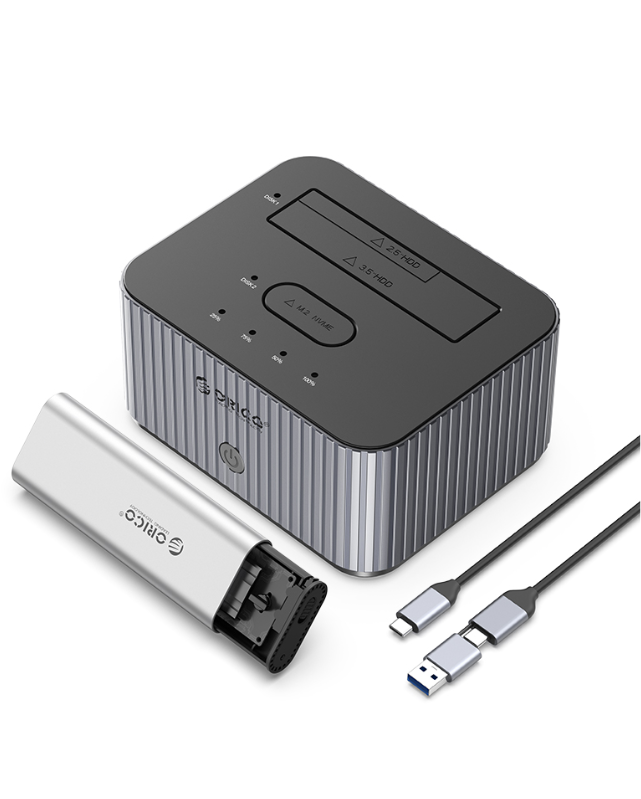 - Estación de acoplamiento ORICO M.2 NVMe y HDD de 2,5/3,5 pulgadas con función de clonación sin conexión, transferencia a 10 Gbps y carcasa disipadora de aluminio (modelo IT28E-C).