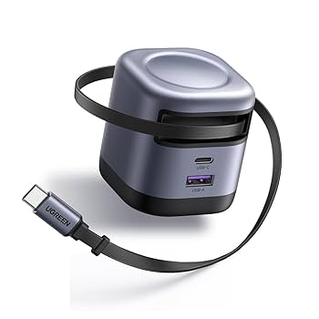- 65W Carga Rápida: Con el ugreen cargador, puedes cargar dos dispositivos móviles como Galaxy S25 y iPhone 16 Pro a toda velocidad simultáneamente, 45W desde el cable retráctil y 20W desde el puerto C